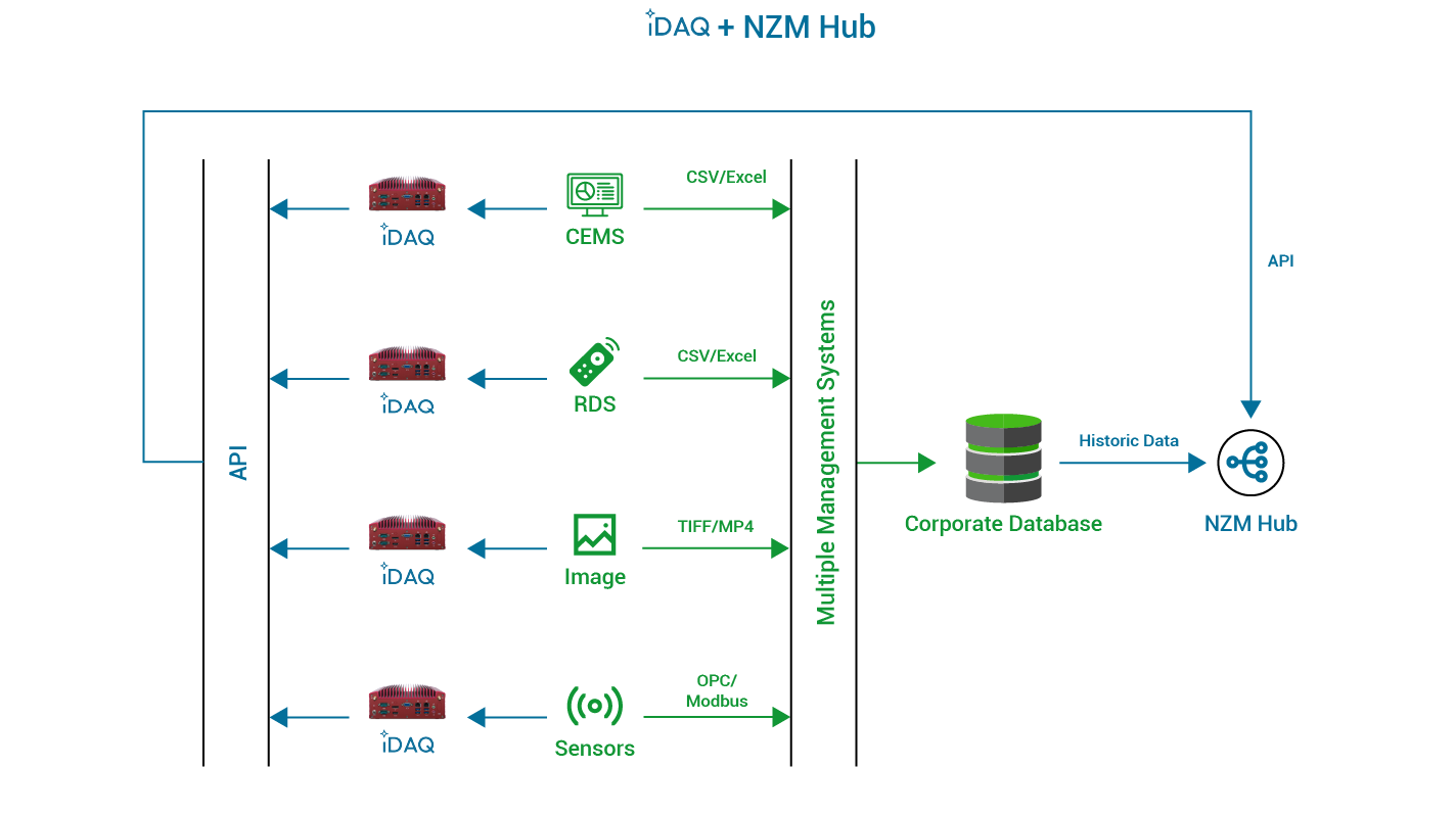 iDAQ can receive any type of data and standardize the data according to the common data standard. It will send the data to Net Zero Matrix Hub (NZM Hub) where it can be calculated, visualized and linked to 3rd party application to be analyzed.